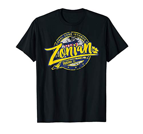 A black t-shirt with a yellow and blue graphic design featuring the word 'Zonian' in a stylized font, surrounded by various elements such as a globe, a plane, and other symbols. The design is centered on the chest area of the shirt. | Zonian Panama CZ T-Shirt - Panama Canal Zone (Seal Of The Canal Zone Isthmus Of Panama) | 04a9dceb0dab3caa29b6381834055f66d81cca4017e8d3df02e7bbc2d38a9e62 | 001401450949 | 0 | 0 | 42 | 16 | 0 | 0 | |