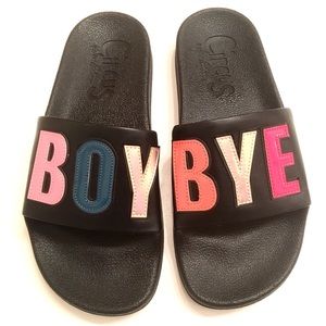 A pair of black flip-flops with a colorful 'BOY BYE' design on the straps. The straps are black with pink, blue, and yellow letters. The flip-flops have a glossy finish and are placed on a white background. | Boy Bye Sam Edelman Slide Sandal Slip On NWOT | 7e556bd507afa1a21cda0e8f25583819bd1a73ec91a8270758fbebb3b78ff5bc | 001401451719 | 0 | 0 | 37 | 9 | 0 | 0 | |