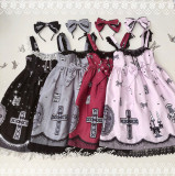 A collection of five vintage-style dresses with lace details and bows is displayed against a white background with a floral pattern. The dresses are arranged in a vertical line, with each dress featuring a different color: black, gray, red, pink, and white. The dresses have a similar design with lace trim and bows, but... | Cross~ Sweet Girl Lolita Jumper -Ready Made | 6ceefa70251826be79a2450b03ab883efab863b1f47286fea5167c1624d28f4b | 001401451918 | 0 | 0 | 57 | 7 | 0 | 0 | |