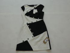 A black and white dress with a geometric pattern is displayed against a white background. The dress has a round neckline, short sleeves, and a fitted bodice with a flared skirt. There are multiple buttons down the front of the dress, and a small tag with a white label is attached to the right side of the dress. | Damsel in a Dress ladies florice black and white dress size 14 | 2b02dc893ae7742c18dbc077306ea30f7cbf9c097b73611e98b82aca91de3212 | 001401452729 | 0 | 0 | 58 | 12 | 0 | 0 | |