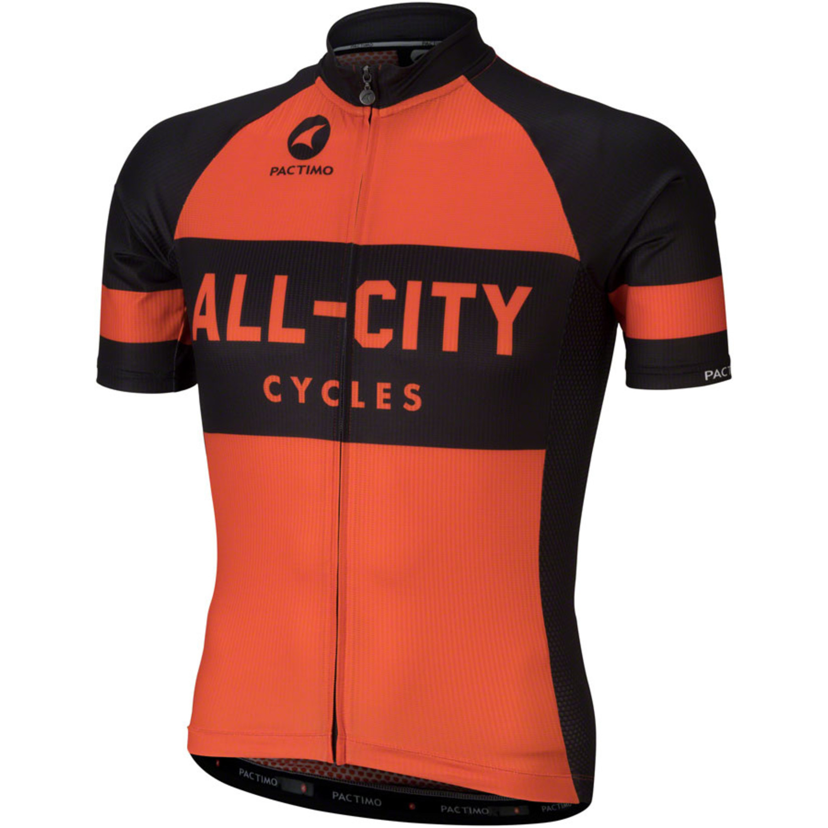 A close-up view of a cycling jersey with the text 'ALL-CITY CYCLES' on the front. The jersey is predominantly orange with black sleeves and a black collar. There is a logo on the left side of the chest and a tag on the collar. The jersey is displayed against a white background. | All-City All-City Classic Jersey - Orange, Short Sleeve, Women's, Large | 1f2c880e82b7cbb714d157478fc1b551cfd12f2efb3acad42f9f8e354c6d599f | 001401453701 | 0 | 0 | 52 | 10 | 0 | 0 | |