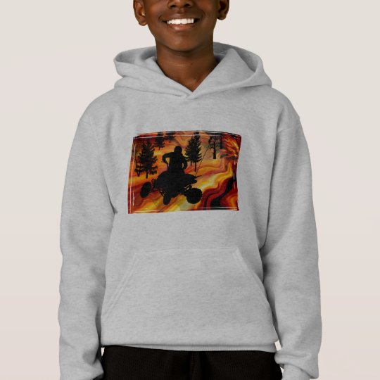 A young boy is wearing a grey hoodie with a colorful graphic of a person riding a motorcycle on a forest trail. | ATV on the Road from Hell Hoodie | 40594503ab2d7dc6772048eda441809500b94f08e77a559e32b6539e8c0fce07 | 001401453998 | 0 | 0 | 22 | 7 | 0 | 0 | |