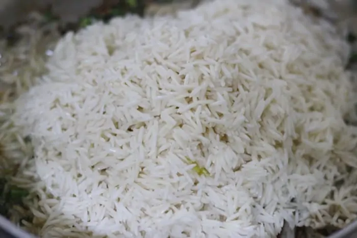 A close-up view of a large pile of white rice with some grains sticking out. The rice appears to be freshly cooked and is piled high in a bowl or container. The focus is on the texture and detail of the rice, with no other elements visible in the background. | soaked and drained rice added to saut\xc3\xa9ed herbs and spices | 3d84b3e0f64078340264b555280afe7454a0625d7eaba3615b2ef62fafb13ace | 001401454020 | 0 | 0 | 50 | 10 | 0 | 0 | |