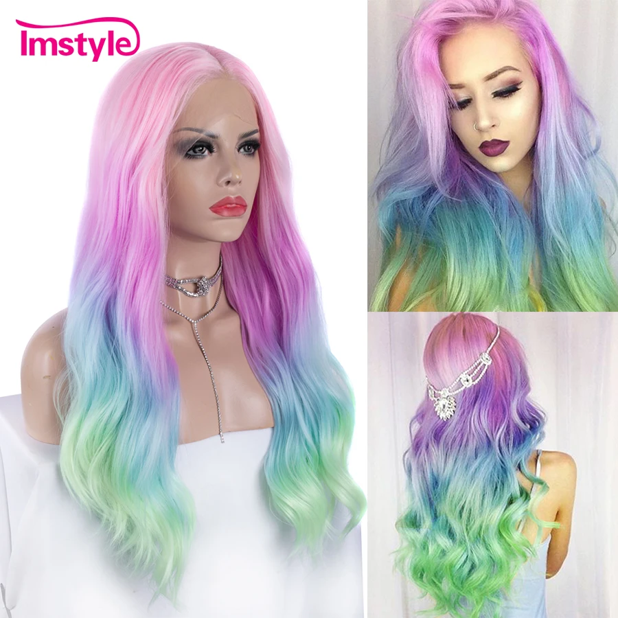 A digital illustration of a woman with a variety of hair colors including pink, blue, green, and purple, styled in long, wavy strands. She is wearing a white top and has a silver necklace with a pendant. The background is a plain white color. | Imstyle Pink Purple Blue Green Wig Ombre Synthetic Lace Front Wig Multicolor Wigs For Women Heat Resistant Fiber Party Cosplay | cb7d3a4721c68190b478f680461fa686fc492c4632114877d4cc522d42c270aa | 001401454269 | 0 | 0 | 44 | 20 | 0 | 0 | |