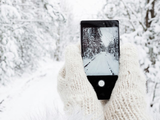 A person is holding a smartphone with a black case, displaying a photo of a snowy landscape with a train track running through it. The person is wearing a white knitted glove on their right hand, and the background shows a snowy forest. | Girl is holding a mobile phone in woolen mittens in the winter against a background of trees in the snow | 33a0029e68335e11d2e2d797a2a302e9fa6a4a215fa0ae0767b03b4594454546 | 001401454525 | 0 | 0 | 43 | 20 | 0 | 0 | |