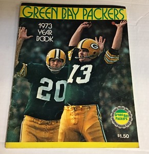 A vintage Green Bay Packers yearbook from 1973 featuring two players in green and yellow uniforms with the numbers 20 and 13. The players are celebrating, with one raising his arms in victory. The yearbook is titled '1973 Yearbook' and has a white background with a green border. | GREEN BAY PACKERS 1973 YEARBOOK FAIR CONDITION | 32b86b075e72546c34014323679fa3dac0451502fda36149b2fcfba86f97e2c7 | 001401454705 | 0 | 0 | 48 | 7 | 0 | 0 | |
