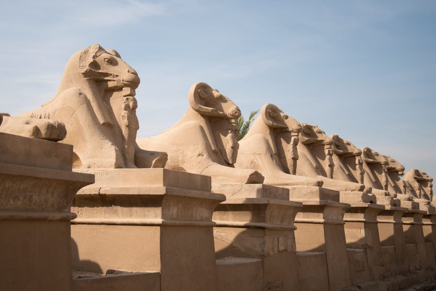 A row of stone sphinx statues with human heads and lion bodies, positioned on a wall with a clear blue sky in the background. | Avenue of the Ram Head Sphinxes - Karnak Temple in Luxor, Egypt | ab7dcde9b49388e17a638ffbb2c05f732eac743cfd5dff12a12ce98f51a0fdd5 | 001401455486 | 0 | 0 | 24 | 12 | 0 | 0 | |