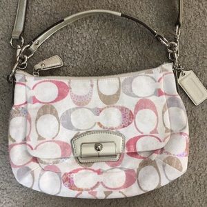 A white and pink patterned Coach purse with a silver buckle and chain straps is lying on a beige surface. | \xf0\x9f\x92\x95 Coach gorgeous fabric crossbody shoulder bag | b3a8608111a4720dccfe6e8794abf362f11616d9ac9757cb79b2effec193ad5e | 001401455769 | 0 | 0 | 20 | 7 | 0 | 0 | |