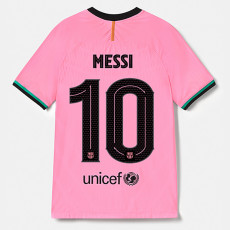 A pink t-shirt with the number 10 and the name 'MESSI' on the back, along with the 'UNICEF' logo on the lower left side. The shirt has a black collar and a black stripe on the sleeves. | MESSI #10 BAR 1:1 Third Fans Soccer Jersey 2020/21 (UCL Fonts) | 4b117a21d8d4d94d0e73f3e219d215b6f52eef91fb410afca03d59c7eae5eba8 | 001401455711 | 0 | 0 | 37 | 11 | 0 | 0 | |