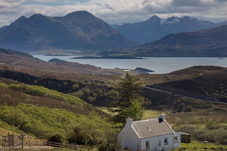 A picturesque landscape featuring a white cottage with a chimney, surrounded by lush greenery and a dirt path leading to it. In the background, there is a large body of water with several boats, and a mountain range with snow-capped peaks under a partly cloudy sky. | Remote Raasay Cottage | 01bb7bc338eb04ba9656bbb00c240e1c8b9b3d5f77dc65c9ec9313c3b09d02a1 | 001401455915 | 0 | 0 | 46 | 3 | 0 | 0 | |