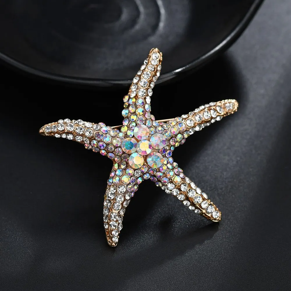 A sparkling, gemstone-encrusted starfish brooch with a golden base is displayed on a black velvet cloth. | Colorful Starfish Brooch | 4d931ff8b0c0a4bbeae544eddb0ff65e0a4885e2a2d115a62eda59a90fd5815c | 001401455799 | 0 | 0 | 16 | 3 | 0 | 0 | |