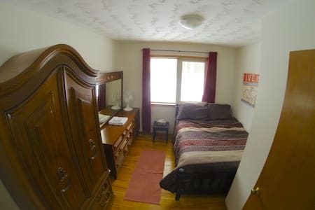 A cozy bedroom with a wooden wardrobe on the left, a bed with a striped blanket in the center, and a wooden dresser with a mirror on the right. The room has a wooden floor, a red rug, and a white ceiling with a light fixture. There is a window with red curtains, and a framed picture on the wall. | Cozy Room! Just outside Kincardine. - Kincardine - \xe7\x8b\xac\xe7\xab\x8b\xe5\xb1\x8b | c45b3bf917ff67bbbafbe75c863580cf4b190ff616e20c8bbd169cab12d8a3e0 | 001401456090 | 0 | 0 | 60 | 9 | 0 | 0 | |