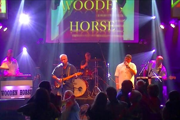 The first image depicts a lively concert scene with a band performing on stage. The band consists of five members: a guitarist, a drummer, a keyboard player, and two vocalists. The guitarist is playing an electric guitar, the drummer is behind a drum set, the keyboard player is seated at a keyboard, and the two vocalists are standing in the center, one holding a microphone. The audience is in front of the stage, with several people visible, some dancing and others enjoying the performance. The stage is illuminated by bright lights, and there is a large screen behind the band displaying the text 'WOODEN HORSE'. | Wooden Horse at Jean's Playhouse in Lincoln, NH | ee14d066dea1aa77470ddcdd43c8e7806ff7575bcecb692796f682bae3071c13 | 001401456115 | 0 | 0 | 105 | 8 | 0 | 0 | |