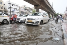 A white hatchback car is parked on a flooded street with water covering the road and the curb. The car is surrounded by other vehicles and people, with a bicycle leaning against a nearby pole. The scene appears to be in an urban area with buildings lining the street. | Waterlogging due to rainfall in New Delhi | 0437e90a76f99f6ffe0e867f58fea56c9e6fbd591c9294310e7bcd308c610737 | 001401456297 | 0 | 0 | 49 | 7 | 0 | 0 | |