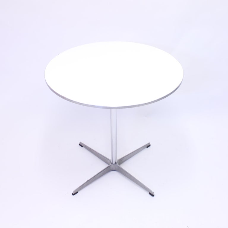 A sleek, modern white table with a smooth surface and a shiny metal base with three legs, set against a white background. | Dining table, model A622 called Circular table, designed by Arne Jacobsen, Bruno Mathsson & Piet Hein for Fritz Hansen. This example from 1987. Marked with sticker on the underside of the table top. Good vintage condition with normal ware consistent | 404e077177dda2cbc7423c21fdc104232f77a44540d0a1072426fc8784c4c515 | 001401456787 | 0 | 0 | 22 | 40 | 0 | 0 | |