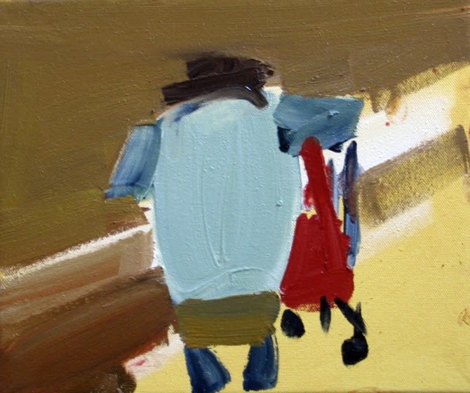 A painting of two figures walking side by side, with one figure wearing a blue garment and the other in a red garment. The painting is characterized by thick, textured brushstrokes and a limited color palette, predominantly in shades of blue, red, and yellow. The figures are depicted with a stylized, abstract quality, and the background is a mix of warm and cool tones, suggesting a scene with a blend of natural and urban elements. | Susie Hamilton Lidl Woman / 3, 2011 Oil on canvas. Signed, titled and dated 25 x 30.5 cm | 2eb1c6841465e75cc251ff9ea06376de5a9e4f53f7add063aefc26416ec65c3a | 001401456786 | 0 | 0 | 75 | 18 | 0 | 0 | |