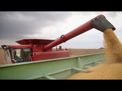 A red combine harvester is parked in a field with a large grain hopper attached to its back. The hopper is filled with golden wheat, and the machine is actively pouring some of the grain into the air. The sky is overcast with dark clouds, and the overall scene has a somewhat gloomy atmosphere. | Explaining a US-China 'trade war' with soybeans | 16f28b8b73c242f1aa96f744d6fa0224c903db4709522d4e76a521bbb00979c0 | 001401456764 | 0 | 0 | 54 | 7 | 0 | 0 | |