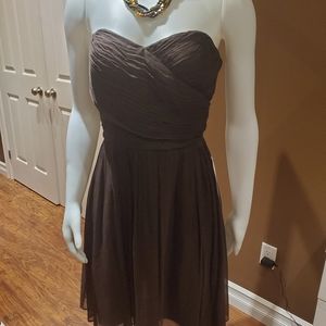 A mannequin is dressed in a brown strapless dress with a fitted bodice and a flared skirt. The dress has a high neckline and a V-shaped back. The mannequin is wearing a gold necklace with a pendant and a gold bracelet on the left wrist. The mannequin is standing on a wooden floor, and there is a white wall behind it. | J. CREW 100% silk occasion dress | 14de9b9fb3f5841f5a91e62857378ae8d0f73b5a996d053bb7340ce13ecee3ce | 001401456912 | 0 | 0 | 61 | 6 | 0 | 0 | |