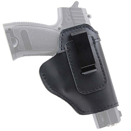 A black leather holster with a silver gun inside is displayed against a white background. The gun has a silver slide and a black grip. The holster has a black snap closure and is attached to a black belt loop. | IWB Holster Leather Concealed with Clip for S&W M&P Shield 9mm Glock 17 18 19 22 23 32 33 36 43 or All Similar Sized Handguns (Right (M Template For M&m Costume) | 5fead77f1b4cfd305ebe9c3a958e03ccd3f3fb69c17f041d615cc7ce8a01919a | 001401456964 | 0 | 0 | 40 | 32 | 0 | 0 | |