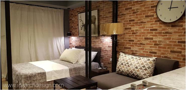 A cozy bedroom with a brick wall and a large window covered by sheer curtains. The room features a bed with a gray and white patterned blanket, a white pillow, and a beige throw blanket. There is a wooden stool with a white cushion on it, and a gray armchair with a geometric patterned cushion. A floor lamp with a beige shade is turned on, casting a warm glow. On the wall, there is a framed picture of a person and a clock showing the time as 10:10. | Rustic Vibe at Azure Urban Residences, Paranaque City: Bedroom by Idear Architectural Design Consultancy | 4bfedbddbf64e8886556748cc61809a48da5cc652d796694f8f2fae2672f397e | 001401457002 | 0 | 0 | 88 | 14 | 0 | 0 | |