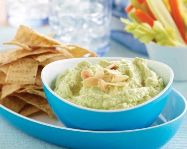 A bowl of guacamole with a sprinkle of chopped nuts on top is placed on a blue plate. The guacamole is creamy green and is served with a side of tortilla chips. In the background, there are two glasses of water and a bowl of carrot sticks. | Avocado and Almond Dip | df56a496ff37b79b5d5a897e663b42ec563444aba1f4ca0fbffef9ea4197e701 | 001401456915 | 0 | 0 | 47 | 4 | 0 | 0 | |