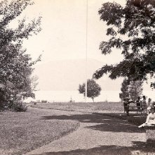 A sepia-toned photograph of a park scene with a woman sitting on a bench, a man standing nearby, and a bicycle leaning against a tree. The background features a body of water, trees, and a mountain in the distance. | Image of 1977.218.0963 - 205. Lake George - East from Mohican House | 079d905c5318876ef4bfc6822749583b06f83cadb4572bb17b8fa31b186e2fc3 | 001401457158 | 0 | 0 | 39 | 12 | 0 | 0 | |