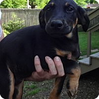 A black and brown puppy is being held by a person with visible fingernails. The puppy has a shiny coat and is looking directly at the camera. The person is standing on a wooden porch with a railing, and there is a wooden fence visible in the background. | Adopt A Pet :: JT in CT - Manchester, CT | 2a97e08b38ef90425976f73352efe85675c4584c54c8ab08d2c9885407982a14 | 001401457226 | 0 | 0 | 48 | 10 | 0 | 0 | |