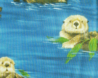 A blue fabric with a pattern of otters swimming in water. The otters are depicted with detailed fur textures and are surrounded by water ripples. The fabric has a woven texture, and the background is a solid blue color. | Loutre, The Last Frontier, 6745, Robert Kaufman, cotton, cotton quilt, cotton designer | 73e10a670816ac140521c0f842fc241cc88579b34af464bb7e6efd030f028837 | 001401457117 | 0 | 0 | 39 | 12 | 0 | 0 | |