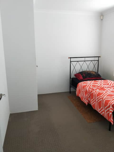 A small bedroom with a single bed covered in a red and orange patterned blanket. The bed has a black metal frame and is placed on a brown woven mat. The room has a beige carpet and white walls. There is a door on the left side of the room and a light switch on the right wall. | Nice & Tidy House near Curtin Univ, City and Cafe | 927e6fdc920015777337de5ca4bd864d56d38e6226ea386a29a944e0387a31a1 | 001401457452 | 0 | 0 | 58 | 10 | 0 | 0 | |