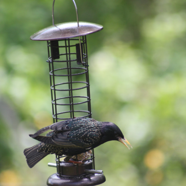 A black bird with a yellow beak is perched on a bird feeder. The feeder is made of metal with a mesh bottom and a hinged top. It is attached to a metal pole. The background is filled with green foliage, suggesting a natural setting. | "Starling" stock image | a69fe3dc3d6e870b6ec98da6c7a6482d4a5876317f5b64fb05b64e017193bf15 | 001401458194 | 0 | 0 | 45 | 3 | 0 | 0 | |