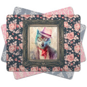 A digital illustration of a framed picture of a blue fox wearing a hat and glasses, with a red scarf, set against a floral background. The frame is ornate and the picture is surrounded by three additional floral patterns, one on each side and one below. | Wolf Placemat | 8fedaf14a76fdc78f94912d60a0e8303cb58c7a974579edcfa21c76077b0fdd1 | 001401458259 | 0 | 0 | 46 | 2 | 0 | 0 | |