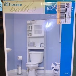 A bathroom display with a toilet, sink, and a shower unit. The toilet is white with a lid closed, and there is a toilet paper holder with a roll of toilet paper to the left of the toilet. The sink is white with a faucet, and there is a soap dispenser on the wall to the right of the sink. The shower unit is white with a glass door, and there is a shower curtain rod above it. The floor is tiled, and the walls are painted in a light blue color. There is a blue and white striped towel hanging on a towel rack to the right of the toilet. The display is enclosed in | Complete Sauder Bathroom Storage Cabinet | 8bb9fbd1a13ba5bace47c776b50c95fc137736c21d3e7dbc33aa50b79b24d38b | 001401458557 | 0 | 0 | 116 | 5 | 0 | 0 | |