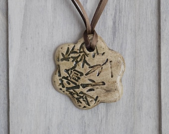 A beige ceramic pendant with a leaf design hangs from a brown cord against a white background. | Ceramic pendant shaped flower print Asian motifs and branches | 43eead2cbc3afa80069e92b00d6a6418a4509b4e45c7da77a9f1d7fa23a0dd87 | 001401458529 | 0 | 0 | 17 | 9 | 0 | 0 | |