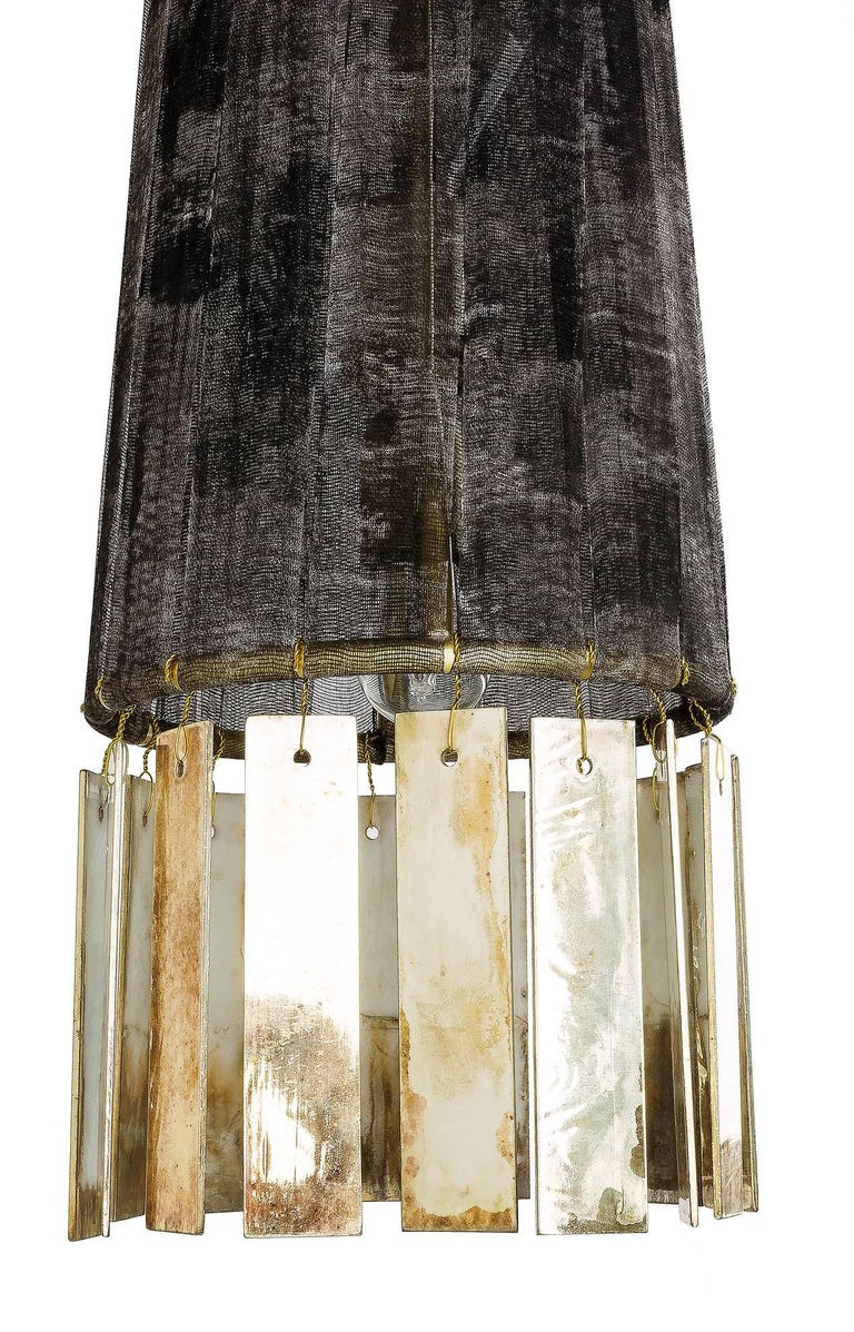 A close-up of a modern chandelier with a textured, dark grey fabric shade and a series of tarnished, aged metal plates hanging from it. The chandelier is set against a white background, highlighting its intricate design and the contrast between the dark fabric and the tarnished metal. | Italian Magic Contemporary Hanging Lamp, Black Hand-Painted Gauze, Double Silvered Glass For Sale | bde749f5b0000bfd4806c287edd59a380a76e2d90d53c0c6563892e1dab666fa | 001401458837 | 0 | 0 | 47 | 13 | 0 | 0 | |