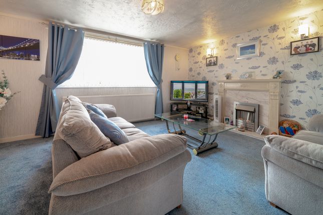 A cozy living room with a blue carpet, a beige sofa with a blue cushion, a glass coffee table with a few items on it, and a white fireplace with a small painting above it. The room has blue patterned wallpaper, a white ceiling with a light fixture, and a window with blue curtains. There are framed pictures on the wall, a vase with flowers on the fireplace mantel, and a small plant on the coffee table. | Living Room of Brougham Street, Greenock PA16 | 031707029e9bc2a87829331e5a96de80e5ea6e00ed440ff11c9a7a80c2013fe0 | 001401458874 | 0 | 0 | 77 | 7 | 0 | 0 | |