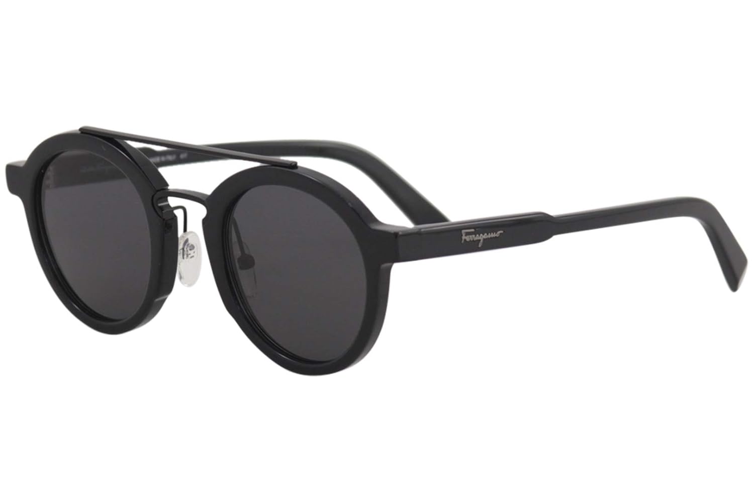 A pair of black sunglasses with a round shape and a thin metal frame. The lenses are dark and cover the entire frame. The temples are thin and have a metal hinge. The brand name 'PERSOL' is engraved on the right temple. The sunglasses are placed against a white background. | d43ebee8a26 Amazon.com Salvatore Ferragamo Men s SF845S Black Sunglasses Clothing | a3024f4d119b81108b9fcdbda00200724fec017ef9a064e55180341d36db2223 | 001401459222 | 0 | 0 | 50 | 10 | 0 | 0 | |