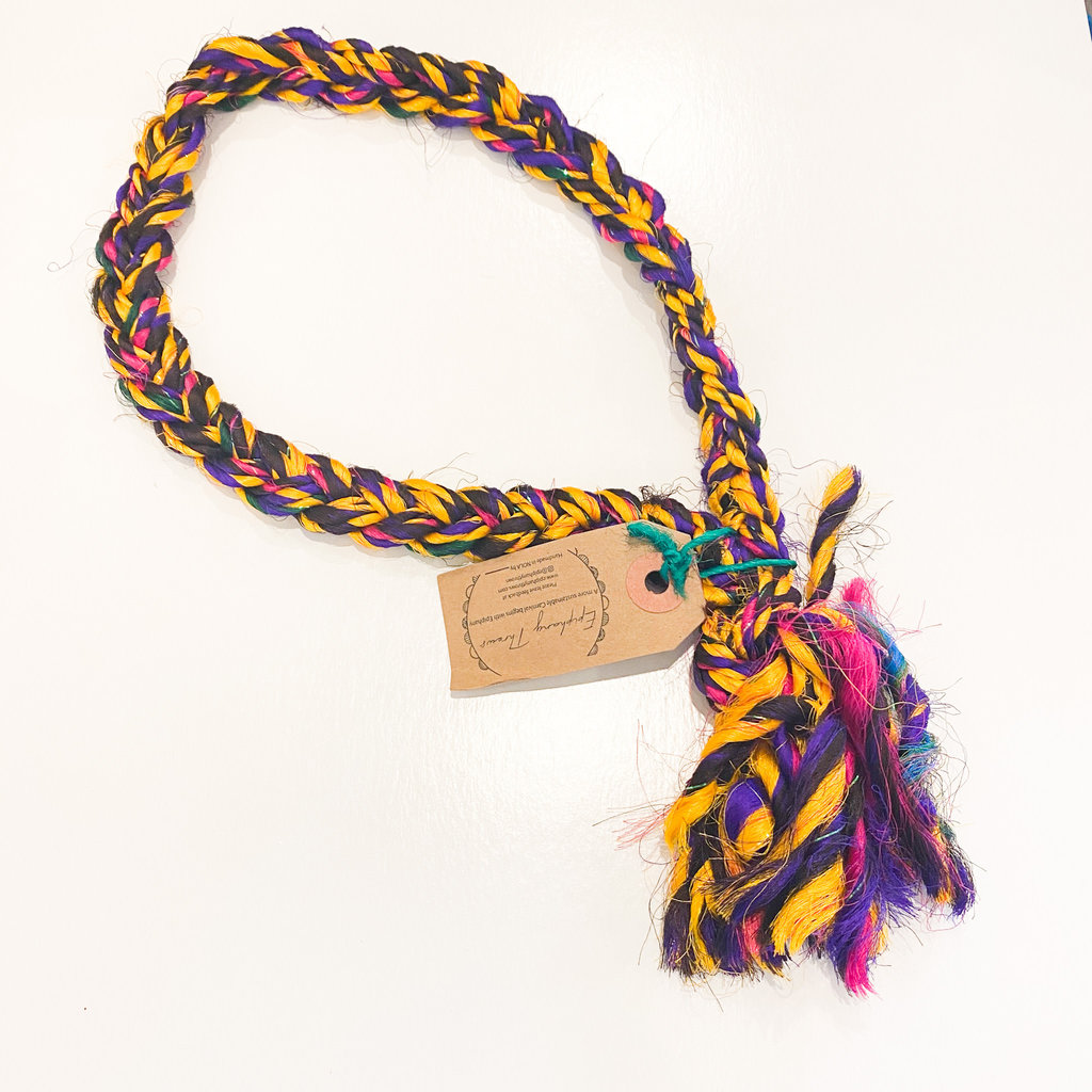 A colorful, braided necklace with a tassel and a tag is lying on a white surface. The braids are in shades of yellow, purple, and blue, and the tassel has a mix of colors including purple, yellow, and blue. The tag is attached to the tassel and has a handwritten message. | Epiphany Throws Braided Silk Necklace- purple/pink/green/yellow | 886597b625e330f764c1f8314235acad0871110ac3454820a361c5b26f05b6e3 | 001401459906 | 0 | 0 | 51 | 6 | 0 | 0 | |