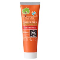 A tube of orange-colored children's sunscreen with a tree and sun design on the label. The label has the brand name 'Tuttifrutti' and the words 'Children's Sun Protection' in white text. There are also some small icons and a black and white logo on the label. | Urtekram Children's Toothpaste Tuttifrutti 75ml | 1cf5dc69d6730b465465f2016a537c59b6017a55178efcec9a9b30022db167e3 | 001401460402 | 0 | 0 | 46 | 5 | 0 | 0 | |