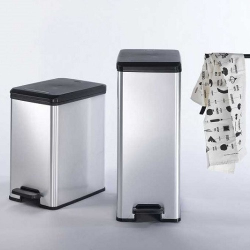 A modern kitchen scene with two trash bins, one large and one small, both made of transparent plastic. The large bin is placed on the right side of the image, and the small bin is on the left. A white towel with a pattern of various kitchen utensils and a few food items is hanging on the right side of the large bin. The background is a plain, light-colored wall. | Slim Bin - Metallic (2 Sizes) - 1 | bf6af1b1e217b239830e272102b7c9d678f6320ac1c81c8a24a2fdb75a2dc7b9 | 001401460849 | 0 | 0 | 70 | 8 | 0 | 0 | |