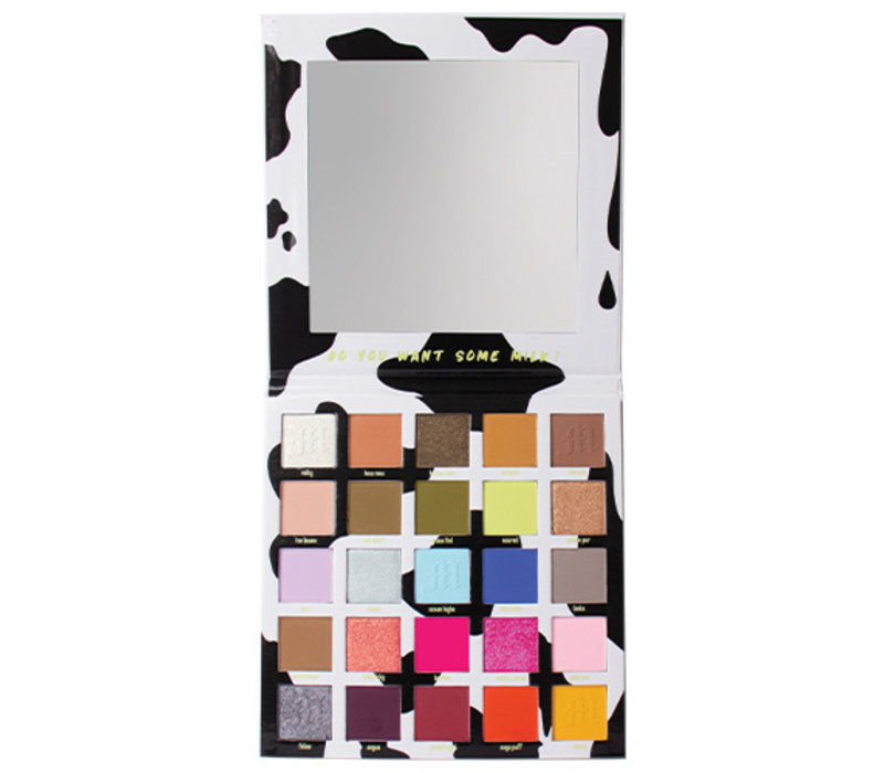 A compact mirror with a black and white cow print design on the cover. The mirror is open, revealing a colorful palette of eyeshadows with various shades of pink, purple, blue, green, and brown. The eyeshadows are arranged in a grid pattern with a black border around them. The mirror itself is clear and reflects the surrounding area. | Made By Mitchell Milk Palette | adcd5fa683330c81c31af44cee77f28bccdada655ee845388ed34f438559d24e | 001229733747 | 0 | 0 | 58 | 5 | 0 | 0 | |