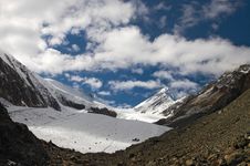 A panoramic view of a mountainous landscape with a clear blue sky and scattered clouds. The foreground shows a rocky terrain with patches of snow, and the middle ground features a valley with a glacier. In the background, two prominent mountain peaks rise against the sky. | Free Mountains And Glacier. Stock Image - 1995491 | 9837e8540d8693341ba03c5a4aff020ddcacebbc585bd851448ba288ae6293f6 | 001229733358 | 0 | 0 | 46 | 8 | 0 | 0 | |