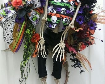 A skeleton dressed in a purple and orange striped shirt and black pants is adorned with a floral arrangement featuring roses, purple flowers, and greenery. The skeleton is standing on a white surface with a black background. | PeppaJack & Hootie Halloween Wreath | 88ac5cbf6a23cc609dc68163248c90b24812dc7c8da73f8b0ca1be64909d8362 | 001229733571 | 0 | 0 | 37 | 5 | 0 | 0 | |