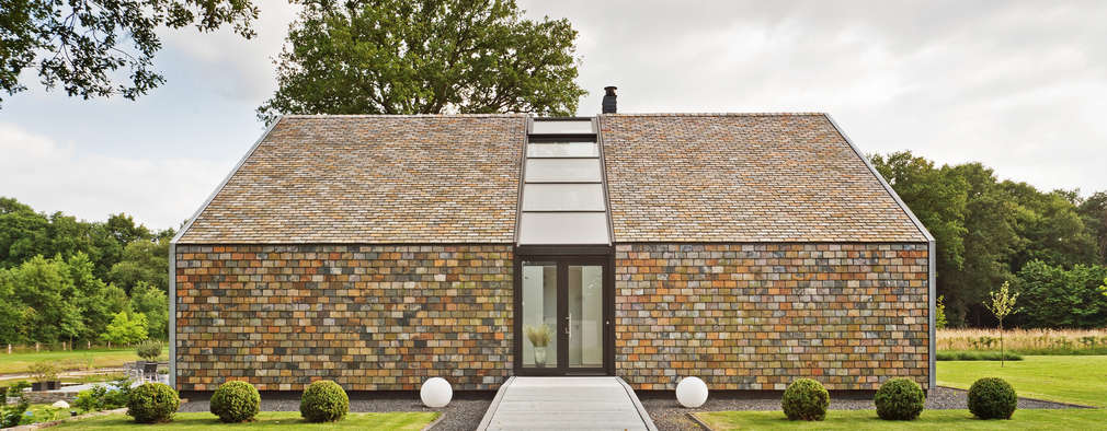 A modern house with a unique triangular roof design, featuring a combination of brick and shingle siding. The house has a large glass window on the right side, and a smaller window on the left. There are two round white planters on the ground, and a set of three rectangular bushes in front of the house. The house is surrounded by a lush green landscape with trees and a clear sky above. | modern Houses by Beltman Architecten | b8895ba98fe009d020e1ee2de7d18b8e3f81faf43907db395daf65f570313865 | 001229734056 | 0 | 0 | 72 | 5 | 0 | 0 | |