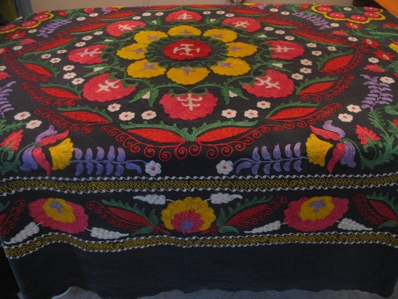 A close-up view of a colorful embroidered tablecloth with intricate patterns and a variety of flowers and leaves. The tablecloth is predominantly black with a rich array of colors including red, yellow, purple, and green. The embroidery is detailed and features a mix of floral and geometric designs. The tablecloth is placed on a surface, possibly a table, and the edges are visible, showing the stitching and the underside of the fabric. | Treasury Item Vintage Hungarian Matyo Folk Art Fancy Needlework BEDSPREAD-OUTSTANDING | e3da5623ff08672097c70b92f2c30543a0d59be250a888ccb4691c92570fa60e | 001229733934 | 0 | 0 | 72 | 10 | 0 | 0 | |