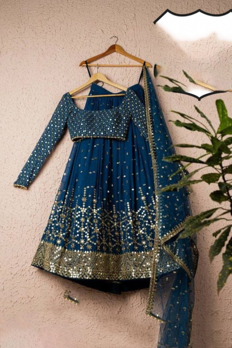 A blue dress with gold embellishments is hanging on a wooden hanger against a plain wall. The dress has a fitted bodice with a high neckline and short sleeves, and a flared skirt. There are gold sequins and beads scattered across the bodice and skirt, giving the dress a luxurious appearance. The dress is accessorized with a matching blue shawl draped over one shoulder, and a gold belt cinched at the waist. The dress is complemented by a pair of gold high heels placed on the floor. | Online Heavy Rama Color Sequins Work Lehenga Choli | 118f9fe361b554e818f2e3daa299fc9f3c11d968f5d0574d76fbd73b45c42be9 | 001229733972 | 0 | 0 | 87 | 8 | 0 | 0 | |