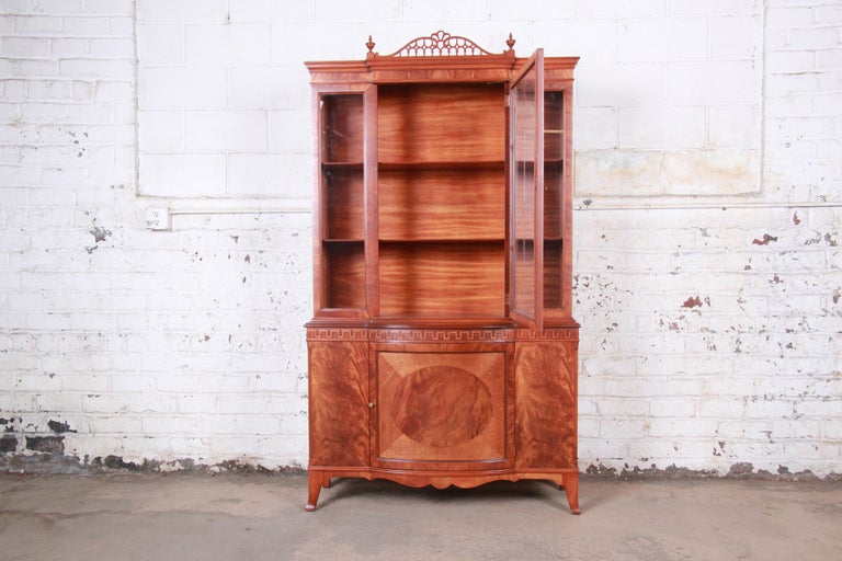 A polished wooden bookshelf with a glossy finish stands against a white brick wall. | American Romweber Flame Mahogany Breakfront Display Cabinet or Bookcase, circa 1940s For Sale | cc1cccadd4d3910d0453a244e9b3363f7a3401dcdb7dd5af9484065b704b4427 | 001229734415 | 0 | 0 | 14 | 13 | 0 | 0 | |