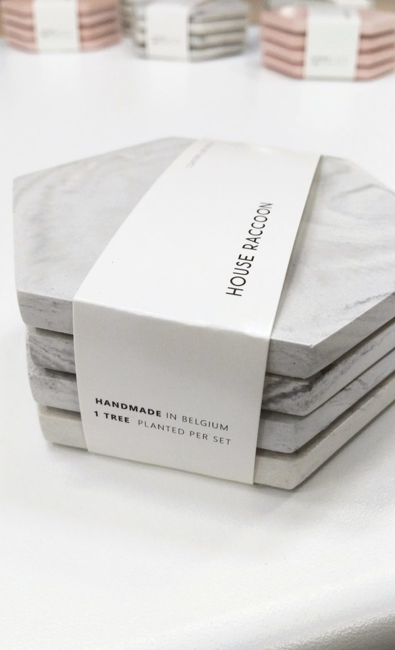 A stack of marble tiles with a white label on top, featuring the text 'House Made in Belgium' and 'Handmade in Belgium, planted per set'. The tiles are arranged in a square shape, with the label covering the top surface. The background is a white surface with a few other items partially visible in the upper left corner. | Dalbane onderzetters - White marble (Set van 4) - House Raccoon | 872be4ee4c1a120701528309ede7893ed7d06ebf1341533f9032383b5a43dc9b | 001229734278 | 0 | 0 | 58 | 11 | 0 | 0 | |