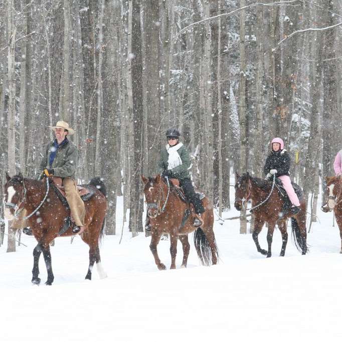 A group of four people is riding horses through a snowy forest. The riders are wearing winter clothing, including hats and jackets. The horses are brown and white, and the snow is falling around them. The trees are bare, and the ground is covered in snow. | Boyne Highlands Equestrian Center | c129bbfa92bf48efc3467049b4a431eb7b8410df331be5e85040587608961a06 | 001229734424 | 0 | 0 | 46 | 4 | 0 | 0 | |