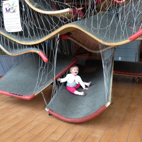 A toddler is sitting in a play structure with a red and blue design, surrounded by a net-like enclosure. The structure has multiple levels and a slide. The child is wearing a white sweater and pink pants. The floor is made of wooden planks, and there is a sign with colorful drawings and text hanging on the wall in the background. | Photo taken at Boston Children's Museum by Tori M. on 5/23/2013 | a38c4951998f39fb20c34a348c765ac0eea11f9b4140d99da38bfd27baaff8c5 | 001229734422 | 0 | 0 | 61 | 11 | 0 | 0 | |
