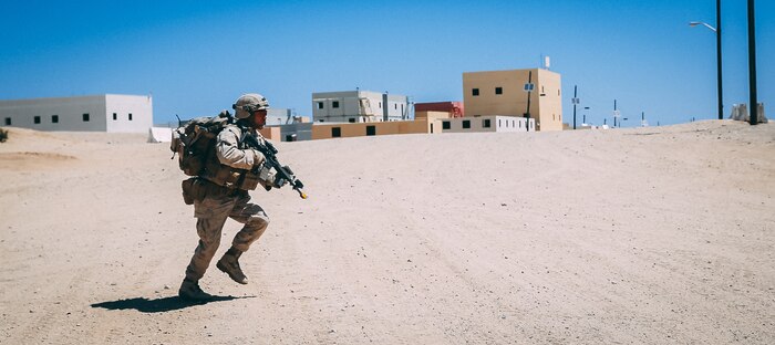 A soldier in full gear is sprinting down a dirt road with buildings in the background. The soldier is wearing a camouflage uniform, a backpack, and is holding a rifle in his right hand. The environment appears to be a desert or arid area with a clear blue sky above. | A Marines with 3rd Battalion, 2nd Marine Regiment, 2nd Marine Division, sprints across an open area during the FINEX at Range 220 as a part of Integrated Training Exercise 3-18 aboard the Marine Corps Air Ground Combat Center, Twentynine Palms, Calif., May 23, 2018. The purpose of ITX is to create a challenging, realistic training environment that produces combat-ready forces capable of operating as an integrated MAGTF. (U.S. Marine Corps photo by Lance Cpl. William Chockey) | bf8554abd4a7dc74e026f5b8901f93de937171fbe4be34269bf79d30fdd42234 | 001229734190 | 0 | 0 | 50 | 76 | 0 | 0 | |